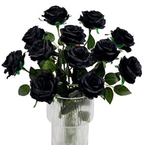 Kisflower 12Pcs Halloween Decorations Black Roses Artificial Flowers Realistic Single Stem Flowers Silk Rose Bouquet for Wedding Party Office Home Decor (Black)