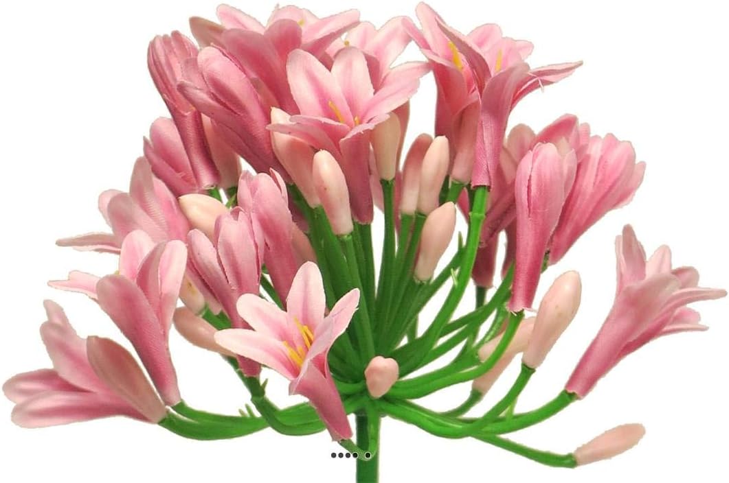 Artificial agapanthus head on stem. Colour: PinkHeight of the synthetic flower: 75 cm Diameter of the flower head: 14 cm. Petal length: 8 cm. Petal material: fabric (plastic petioles). Stem material: reinforced plastic – modular (Can be cut off the stem to adjust the size of the flower. We advise you to use a cutting pliers for this operation)Ideal for floral or vegetable composition, fresh or synthetic. The diameter of the flower head will bring density to the whole.