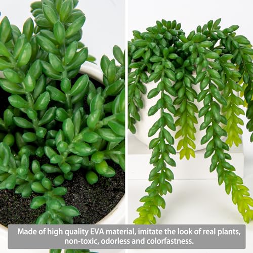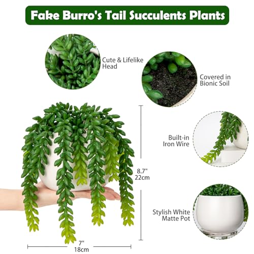 - Artificial Succulents in Pots – Our artificial succulents are cute and unique, there has lifelike burro’s tail succulent, with attactive gradient color, are perfectly displayed in a white pot. This artificial potted plants has natural look, lifelike color and soft touch, it will make a stunning addition for your space.